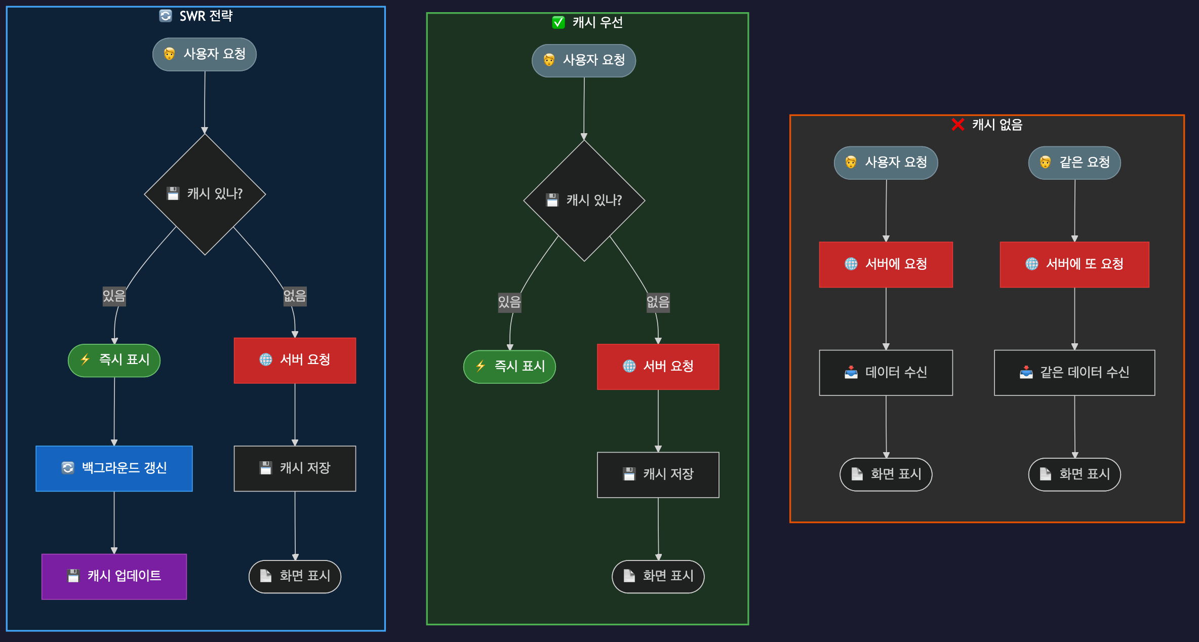 캐시 없음, 캐시 우선, SWR 전략의 차이를 다이어그램으로 살펴보겠습니다.