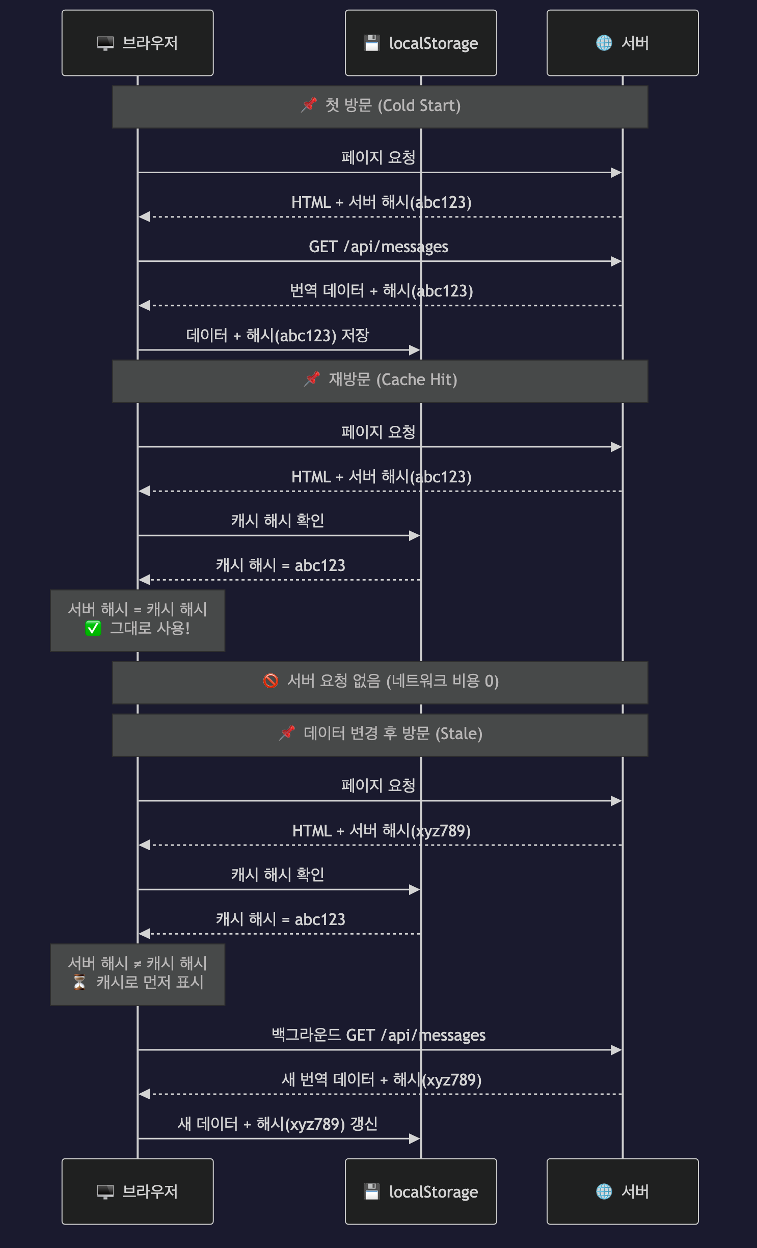 아래 시퀀스 다이어그램은 첫 방문(Cold Start), 재방문(Cache Hit), 데이터 변경 후 방문(Stale)의 전체 흐름을 보여줍니다.