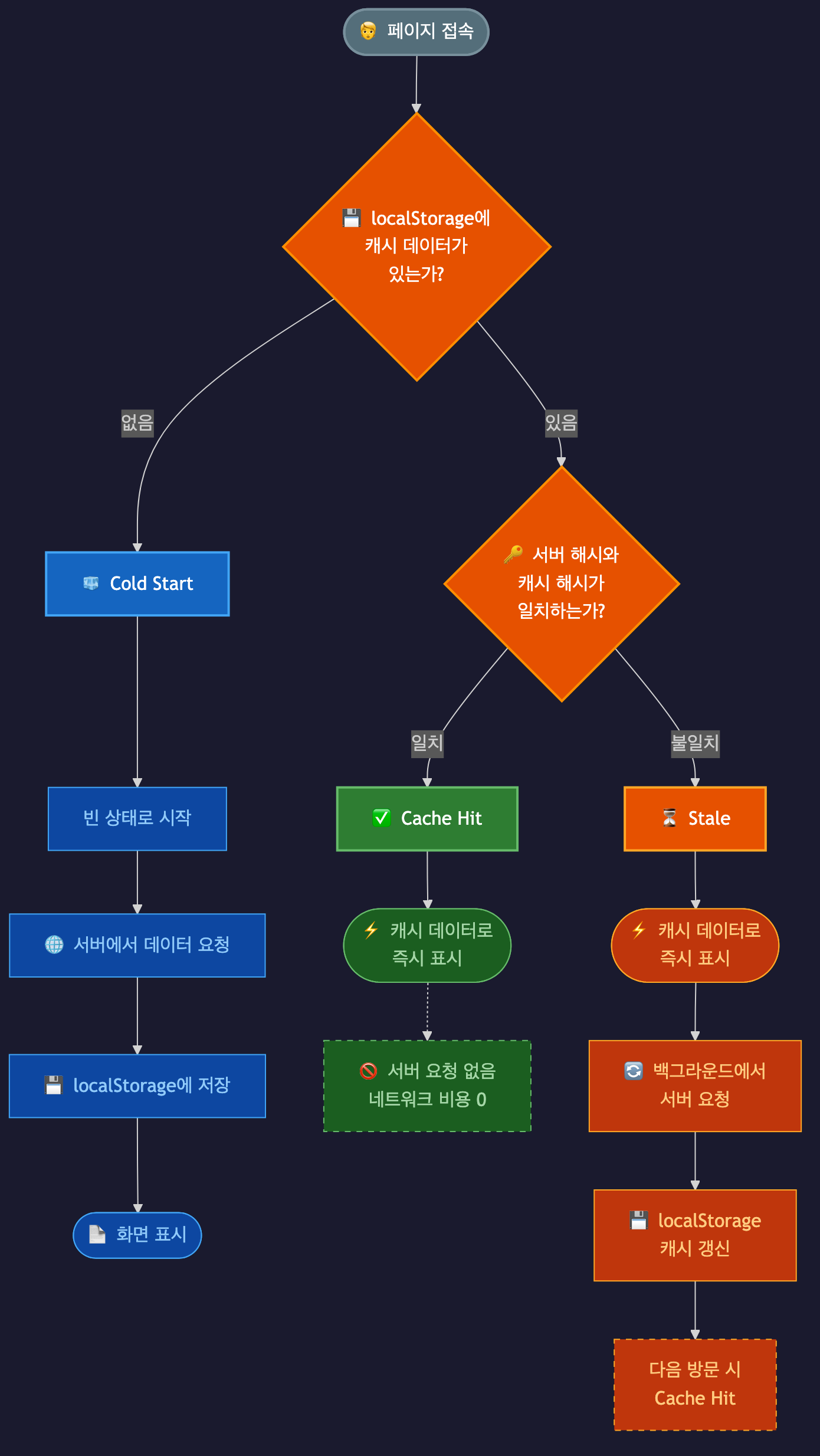 | Stale | 해시 불일치. 캐시로 즉시 표시 + 백그라운드 갱신 |